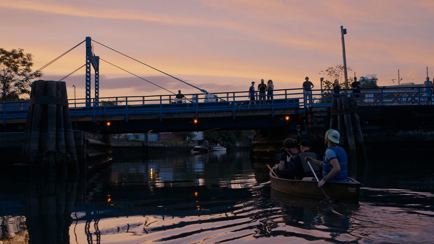 Along with challenges, the film also brought the couple joy. “I love the moments when you’re shooting something and you know, ‘this is it.’ You feel something magical happening in front of you, and you’re there as part of it. It’s just the best feeling,” Courville says. One of these moments was a 90-minute guitar performance by Elliott Sharp on a canoe floating along the Gowanus Canal. “It had a transcendental feeling,” she recalls.
