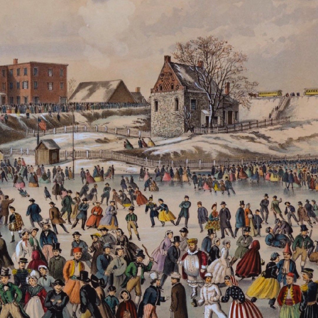 The Old Stone House shared this colorized copy of a lithograph published by the Brooklyn Daily Eagle, showing “a dress carnival of the Washington Skating Club, held in Brooklyn at a rink near the Gowanus Stone House, on February 10, 1862.” This skating ground would later become a Major League Baseball stadium, and the original home of the Brooklyn Dodgers. In the winter off-season, the skating tradition continued, with baseball games on ice!