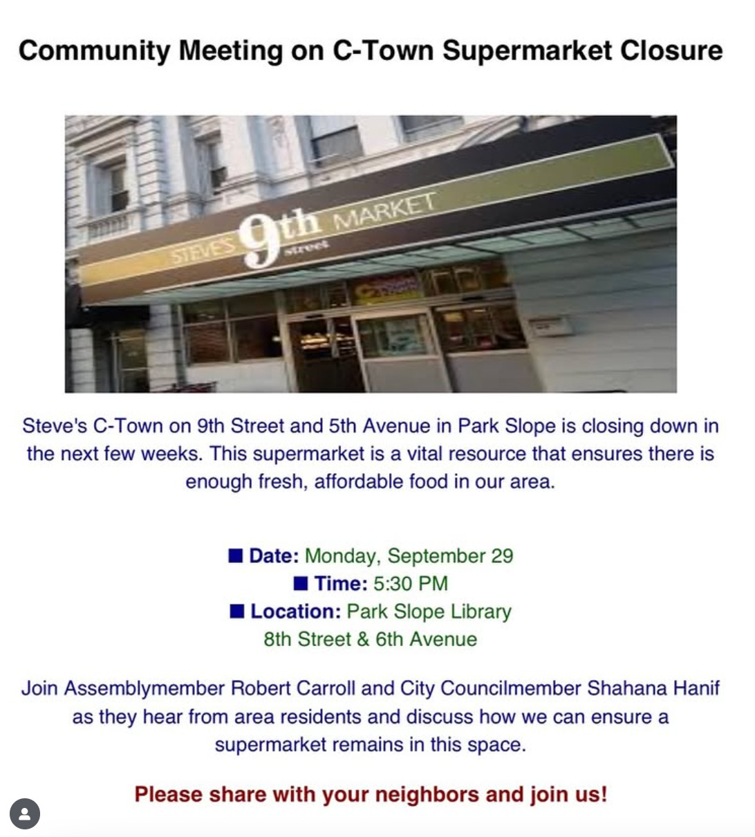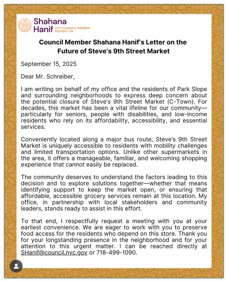 Photo: Park Slope Together September 15, 2025: Council Member Shahana Hanif sent a formal letter to the building’s owners Michael and Philip Schreiber to emphasize the market’s importance as a vital resource for the community, especially seniors and low-income residents, and to advocate for a seamless transition to another supermarket.