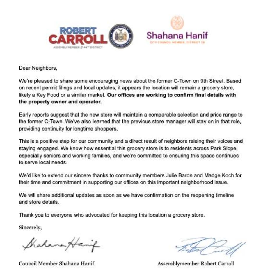 October 10, 2025: Robert Carroll and Shahana Hanif’s offices' share an update that the location will remain a grocery store.