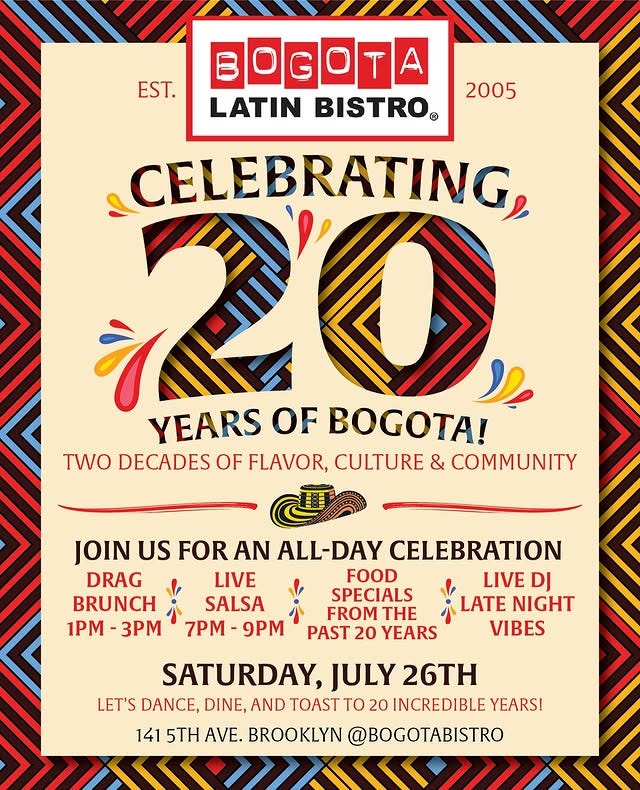 Bogota Latin Bistro is turning 20! Join them for an all-day celebration on Saturday, July 26th, featuring a drag brunch, live salsa, a DJ, and food specials.