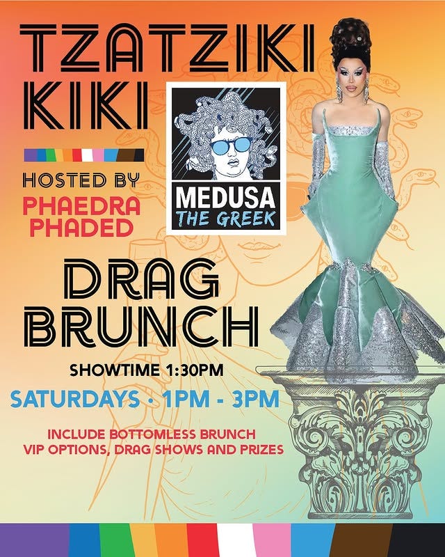 - Tzatziki Kiki @ Medusa The Greek: Celebrate love, queerness, and tzatziki every Saturday in June from 1-3pm at Medusa. Includes bottomless brunch option, drag shows, and prizes! RSVP here.