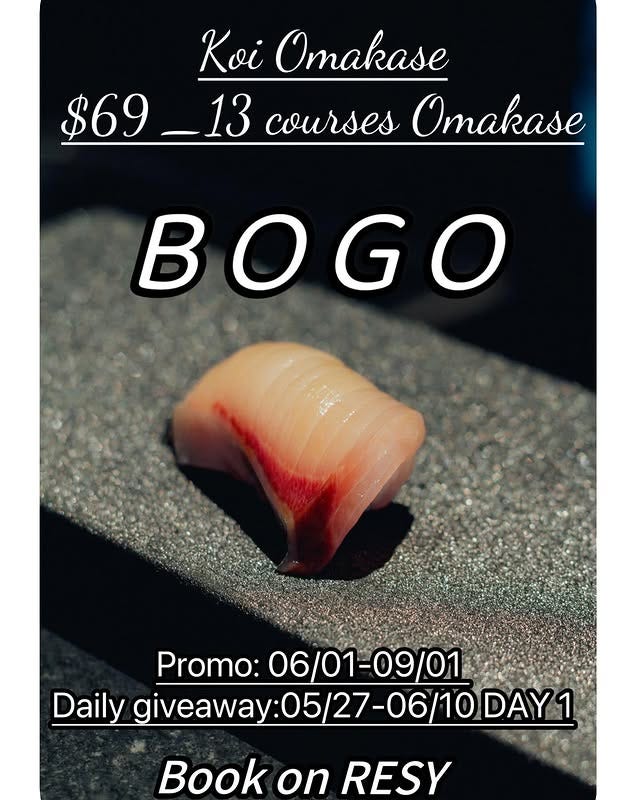 - BOGO deal @ Koi Omakase: To celebrate their 2nd anniversary, Koi Omakase is offering a their signature $69 13-Course Omakase buy one, get one free from June 1st – September 1st! Book on Resy.