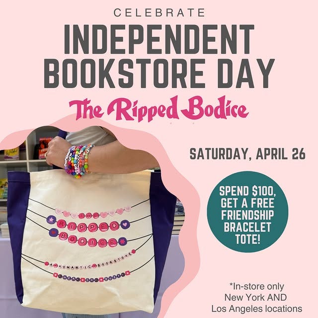 Saturday, April 26th is Independent Bookstore Day, and The Ripped Bodice is celebrating by offering a free friendship bracelet tote to customers who spend $100!