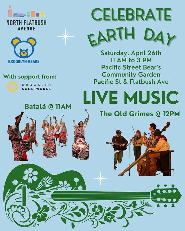 Celebrate Earth Day @ Pacific Bears Garden (Flatbush Ave & Pacific Street), 11am-3pm: North Flatbush Avenue is celebrating Earth Day with a day full of eco-friendly fun - and what’s a celebration without live music? Catch live performances from @batalanewyork at 11 AM and @theoldgrimes at 12 PM. Come for the music, stay for the workshops, garden activities, book & seed swap, and more! FREE.