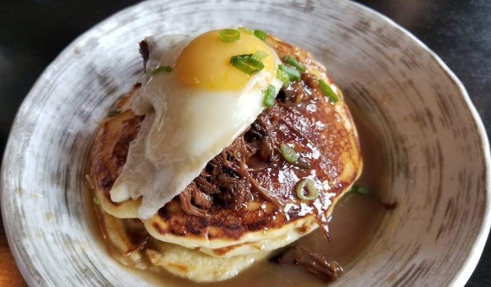 Creative dishes like Pretzel Pork & Chive Dumplings, Crispy Oyster-Bacon Pad Thai, Korean Fried Chicken with Spicy Kimchee Yogurt, Grapes and Mint, and even a "breakfast ramen" during brunch.
