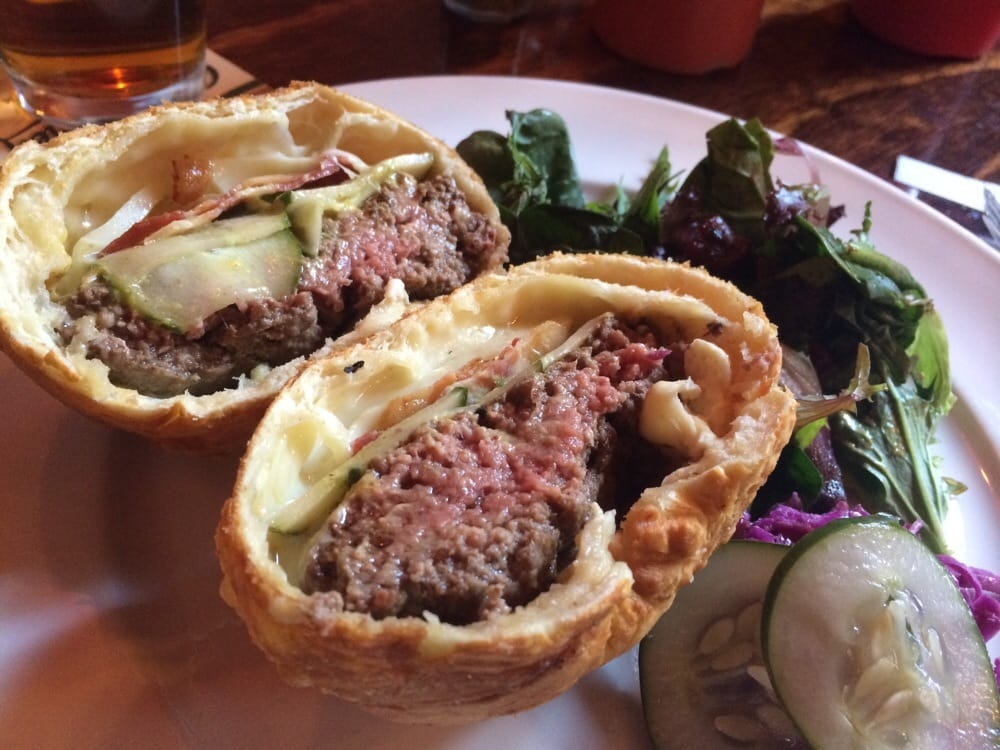 Signature deep-fried burger: the patty was wrapped in Hungarian lángoš dough and fried, creating a unique and delicious experience. I was fortunate to try one myself and I can confirm they were rare inside as they look in this photo - and very tasty.