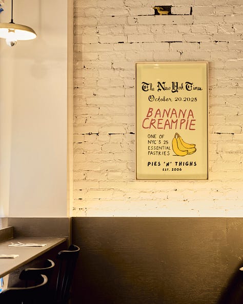 The decor in the new space will also have its own personality. While the Williamsburg restaurant has a more DIY vibe, the Park Slope location is a bit more structured, yet still encompasses the personal touches you’d expect to see at Pies ‘n’ Thighs. Sanneh’s mom, Cheryl, is a ceramicist, so she made the shades for the pendants along the bar, as well as a few sconces, a ceramic Coors Light sign that’ll be a sconce and lit from behind, and some ceramic pies that she went rogue to create (“You just have to let her be Cheryl!” - Sanneh). “To me, it’s such a funny symbol of Pies because it’s handmade, it’s sort of funny, it also takes a lot of skill, and it’s something that will make the place feel like Pies – having a quirky little piece of art from my mom on the wall,” says Sanneh. There will also be a picture hanging from the Rock Star Bar bathroom, their original dive bar space, and other nods to their long history.