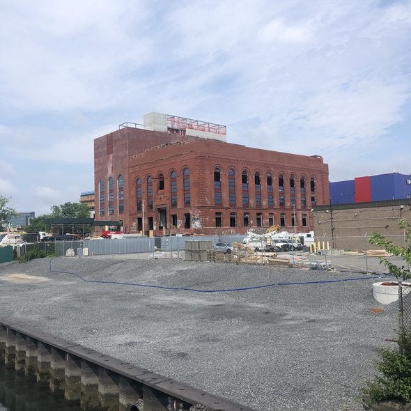 The building is being turned into an arts space called The Powerhouse Workshop. Their website says the new facility “will house fabrication and production facilities in wood, metal, ceramic, textile and print.” The building on the left is completely new but was built on the footprint of a boiler house that was torn down in the 1950s (can be seen in the 2nd photo).”