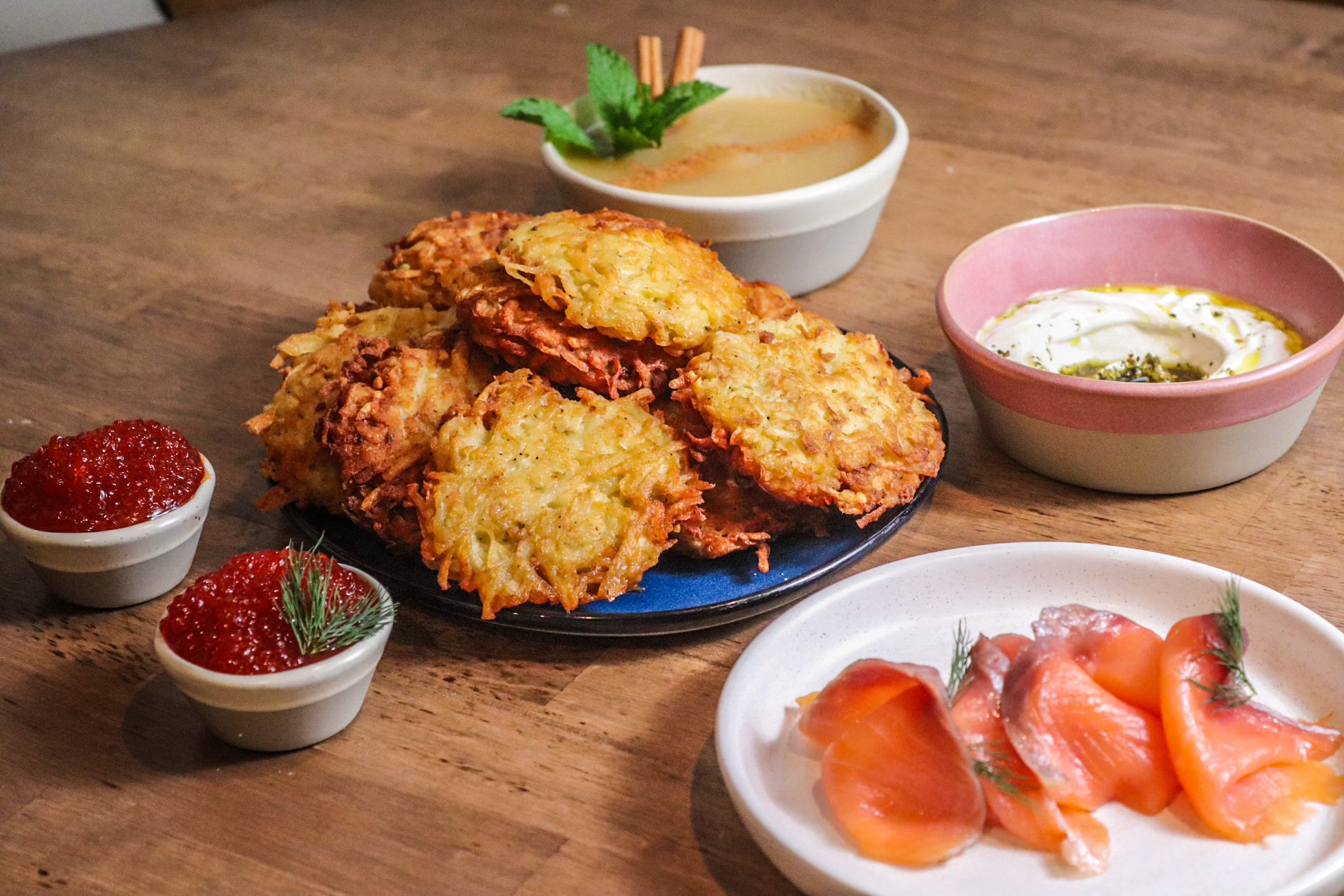 Hanukkah @ Miriam (Dec 14-22nd): Miriam is going big for Hanukkah this year, serving their beloved gluten-free Chickpea Latkes - extra-crispy thanks to chickpea flour, a trick passed down from Chef/Owner Rafael “Rafi” Hasid’s mother - plus House-made Raspberry Sufganiyot dusted generously in powdered sugar (holiday uniform, no complaints). Latkes are DIY-style, with topping add-ons like labneh, smoked salmon, salmon roe, applesauce, and crudités to build your perfect plate. The specials will be available from Dec 14- 22nd and are available at the restaurants or as a takeaway platter for Hanukkah celebrations at home.